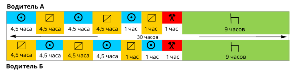 В течение 30 часов после периода ежедневного или еженедельного отдыха водитель, занятый вождением транспортного средства в экипаже, должен воспользоваться новым периодом ежедневного отдыха в течение не менее 9 часов.