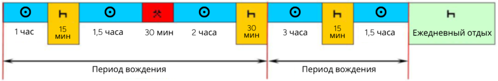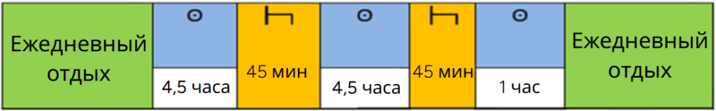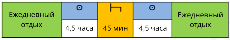 После периода вождения в четыре с половиной часа водитель обязан сделать непрерывный перерыв не менее 45 минут, если не начат период отдыха. Этот 45-минутный перерыв может быть заменён перерывом не менее 15 минут с последующим перерывом не менее 30 минут.