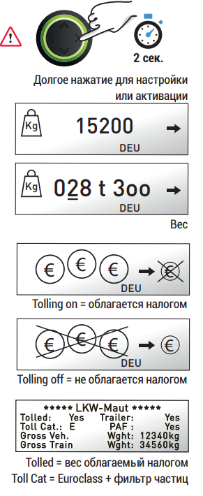ИСКЛЮЧЕНИЕ: при наличии официального разрешения можно отключить оплату пошлин. Незаконная активация или деактивация влечет за собой Вашу личную ответственность перед сборщиками дорожных пошлин в Германии.