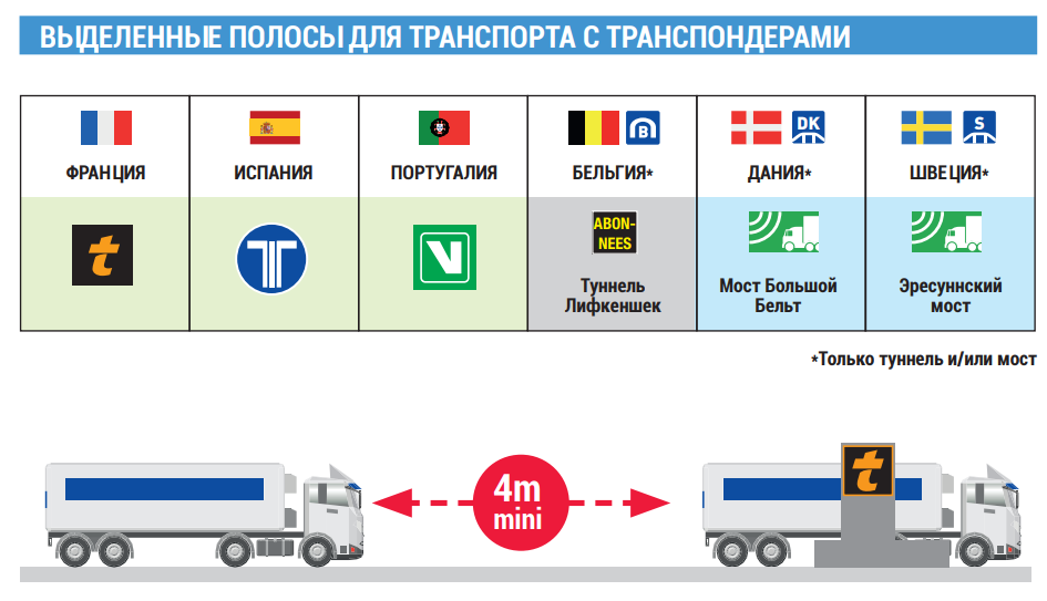 (1) Автострады во Франции, Испании, Португалии, туннель Лифкеншек в Бельгии, Эресуннский мост в Швеции и мост Большой Бельт в Дании.