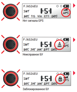 БУ не принимает GPS-сигнал. Для хорошего приема GPS-сигнала переместитесь на открытую местность, за пределами туннеля, здания, леса, склада … Примечание: в дорожной сети Бельгии или Германии при длительном отсутствии сигнала GPS зажигается мигающий красный цвет.