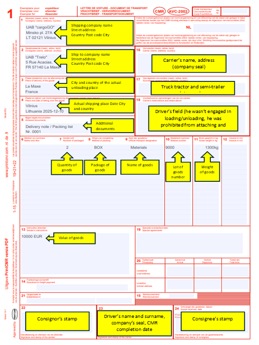 CMR, a consignment note drawn up in accordance with the Convention on the Contract for the International Carriage of Goods by Road, certifies the conclusion of a contract for the carriage of goods between a customer company and a carrier. The carrier is responsible for the integrity and preservation of the goods from the time the carrier accepts the goods for carriage and until the goods have been unloaded at consignee’s warehouse. The carrier is further responsible for checking the correctness of data on the number of package units (colli), marking and package appearance entered into the CMR.