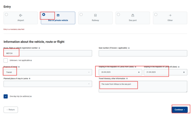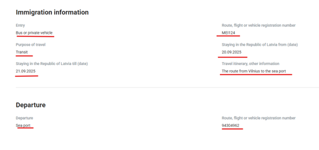 - Indicate the means of transport you will use to cross the Latvian border when entering the country (in this case — by bus). Enter the bus number, the expected dates of border crossing, and be sure to specify the reason for crossing the border or your travel plan (in this case, as in the example — you are crossing the border to reach the port):