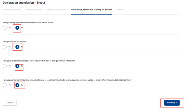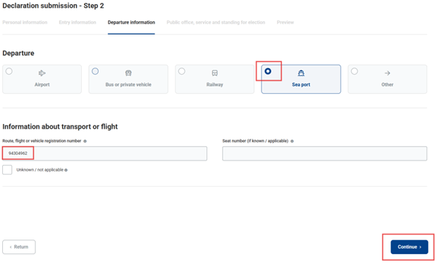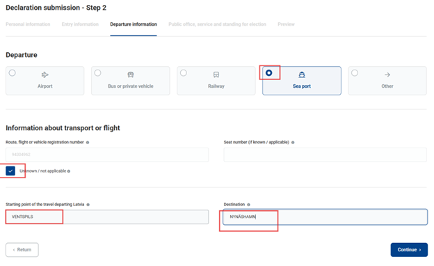- Be sure to indicate how you will cross the Latvian border when traveling to another country. If the ferry or other transport details are still unknown, check the box ‘UNKNOWN’.