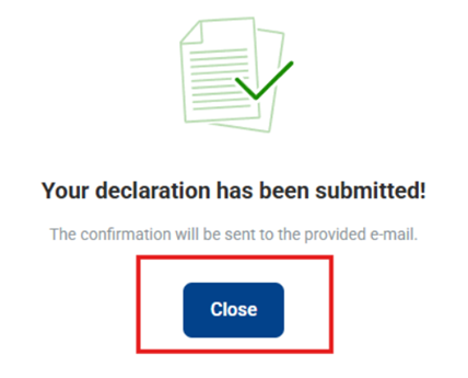 - After submission, you will receive a confirmation email stating that the declaration has been completed. Within 48 hours, you will receive an additional email confirming the registration of the declaration, along with a unique declaration number. Please note that if false information is provided, a financial penalty may be imposed during the verification process.