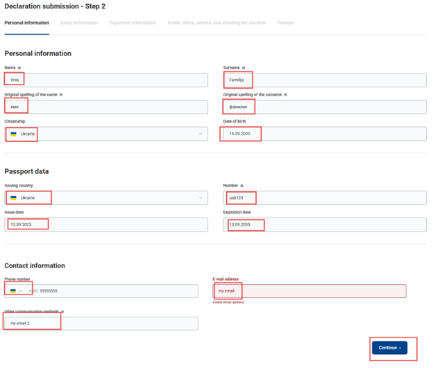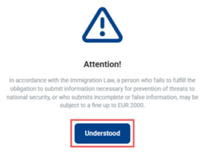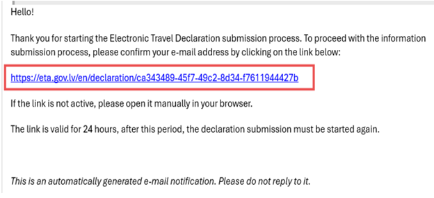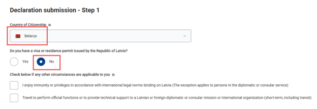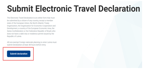 We inform you that any foreign citizen planning to cross the territory of Latvia (including for transit purposes) must submit a declaration via the system no later than 48 hours before arrival. The declaration must be submitted online at www.eta.gov.lv. Failure to submit the declaration or late submission, if discovered during inspection, may result in administrative fines of up to EUR 2000. Below you will find a guide on how to complete the declaration.
